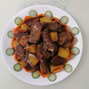 烧到排骨七八分熟,加盐,就可以下土豆,烧到剩一点水份,就可以了出锅了。
