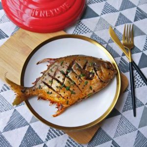 金鲳鱼两面划上花刀(目的是让腌制时候方便入味,也比较容易熟)。