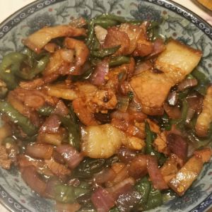 3、热锅放油,放入五花肉煎焦一点,继续放入洋葱翻炒一会,再放辣椒炒会,然后再放一勺生抽、一勺耗油翻炒会,最后放入盐和糖。打完收工!