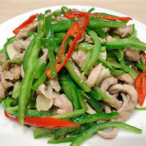 1.肉丝熟后加入红辣椒、蒜片炒香