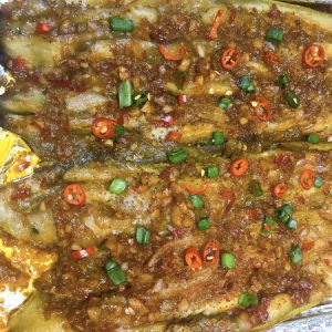 1⃣️烤盘上垫锡纸,把茄子洗净擦干水分,在表面刷上油,放烤箱.上下180度烤30分钟.