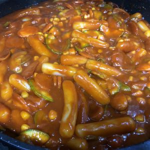 放入脆皮肠,放入年糕条,放入韩式辣酱一盒,一起翻炒,根据情况,适当加点水!我加的是煮年糕条的面汤,需要不断翻炒,辣酱很容易糊!我正好有点玉米粒,也一起放进去了!