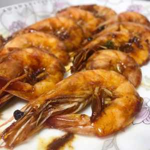 将调好的酱汁倒入,倒完可以在碗中加一点水,这样能把挂在碗中的剩余酱汁充分利用完。多焖一会儿,让酱汁渗透到虾肉里。
