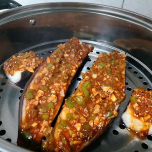 辣酱做好后,可以用勺子均匀的铺在茄子上,这样,熟了之后更加入味,颜色也好看。继续蒸煮,因为大家使用器材,火候不同,看到茄子软嫩,茄子周围可以用筷子轻扎,熟透即可。