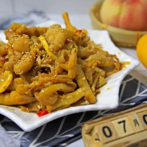 将蒜末,生姜丝,小米椒末,柠檬片放入,在加入适量生抽,陈醋,盐,香油,耗油,白糖,搅拌均匀。放入冰箱冷藏2小时入味。