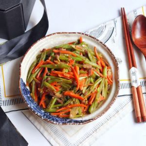 烹饪前处理好食材,撕掉头尾根茎,然后洗净切成斜刀块,这样能扩大受热范围,其次将胡萝卜洗净切成细丝,猪肉切成细条;