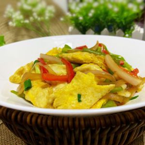 洋葱、青椒、红椒都切丝,香葱切碎。