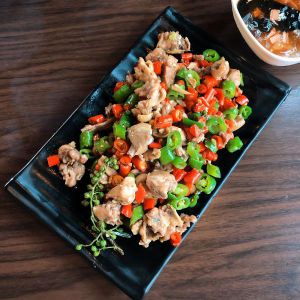 辣椒下锅和鸡块一起翻炒,放料酒、生抽、老抽、蚝油一起翻炒,稍微多炒一会,让鸡块和辣椒都入味些,最后放点盐出锅.