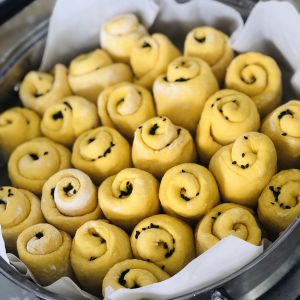蒸盘垫上油纸,把馒头均匀摆放在里面,撒上黑芝麻(注意不要摆得太密,不好发酵,我这个摆密了一点所以蒸出来口感没那么松软)