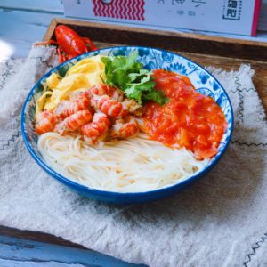 加上蛋皮,小龙虾肉,番茄,撒一点香菜末,搅拌均匀就可以吃啦