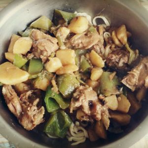 将煮好的面条铺盘底,将炖好的鸡肉倒入盘内,美味的大盘鸡就做好了。