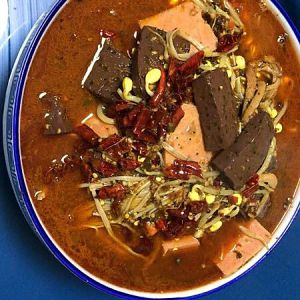 干辣椒切段,熬油浇在毛血旺上面。完成