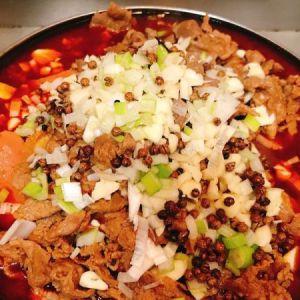 锅放底油,然后放入豆瓣酱、火锅底料、老干妈辣椒酱、葱姜蒜,煸炒出香味烹入料酒、生抽、老抽然后放入适量的水,接着放入适量的盐、鸡精调味。