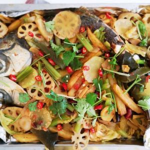 鱼从后背打开,斜切几刀,用盐、料酒、姜片腌制二十分钟