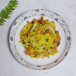 火腿肠切丝,然后放入土豆里,再放入葱花,黑芝麻,打入一个鸡蛋,搅拌均匀。
