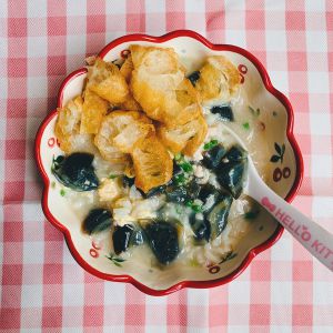 3、盛到碗里后,撒上一点油条碎,口感更香(我们潮汕皮蛋粥的特色)