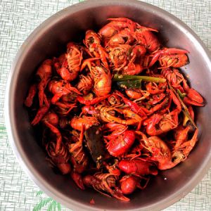 龙虾放入炒香的大料中,加耗油,盐,进行翻炒,然后加入准备好的两罐啤酒,适当的热水,莫过龙虾即可,然后再加入盐,豆瓣酱,小茴香,辣椒粉,八角,花椒一起煮,小火煮十五分钟。期间可以用汤匙或者筷子尝一尝汤汁的口感,如果不够咸不够辣自己可以适当调整,(这里汤汁一定要比平常咸,不然龙虾入不了味。)