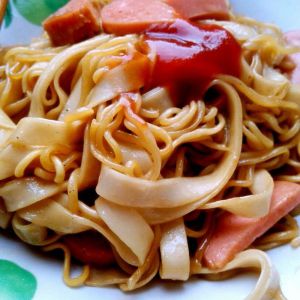 然后少放些油,把煮好的方便面挂面和香肠放在锅里,翻炒,在放盐,味精,酱油,胡椒粉,三分钟后出锅,按自己口味放番茄沙司