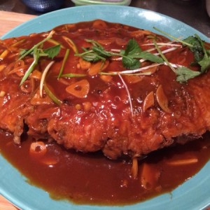 把烧好的汁浇到炸好的鱼上,撒上葱丝和香菜。