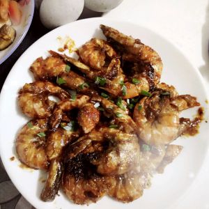 起火,油加热后放入葱姜蒜煸炒,放入番茄酱,料酒,生抽,醋,白糖,随后放入准备好的虾