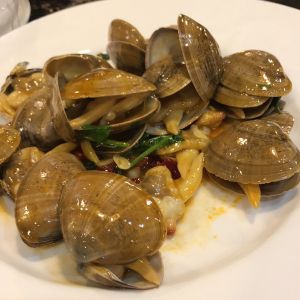 放入豆瓣酱翻炒,倒入花蛤,继续翻炒,期间放入少量盐巴、料酒、红烧酱油,继续翻炒,当花蛤都张开口即可