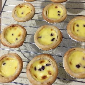 取出蛋挞烤盘,将蛋清刷在每个蛋挞边缘防止烤焦,再放入烤箱继续烤5分钟