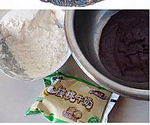把黑米面、面粉放入盆里,加入发酵粉,再倒入牛奶,至发酵粉融化,搅拌成面团。