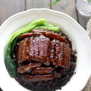 最后覆盖上浸泡好的梅干菜,上锅中小火蒸2.5-3个小时。蒸好以后再取一个深盘盖在这个碗上,掉转90度,让两个碗竖起来,把汤汁控到一口锅里烧开,调一点水淀粉,把汤汁熬制粘稠浇在扣肉上即可