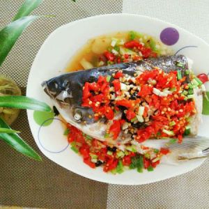 把爆香的姜蒜,和剁辣椒放在鱼头上!继续蒸十分钟!