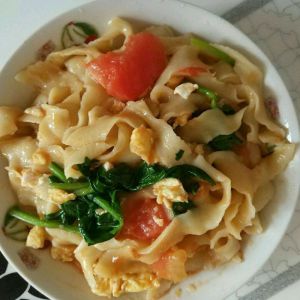 准备好所需食材,西红柿去皮切块,鸡蛋打撒,菠菜切段 ,面条,准备一个小碗调汁(生抽两汤勺,鸡精一小勺)