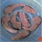 将鱼身平放在案板上,顺着鱼的脊梁骨平劈开;将带脊梁骨的一半鱼身,切成约1厘米厚的鱼块,放入篮子里晾干表面水分;