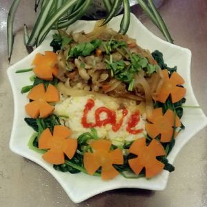 菠菜沿盘子摆一圈,上面放胡萝卜片,上面放上