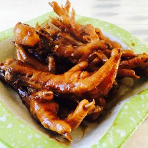 倒入鸡爪炒片刻。放入生抽、老抽、料酒炒出香味。放入干辣椒、大料、冰糖炒一会,放入热水小火煮50分钟