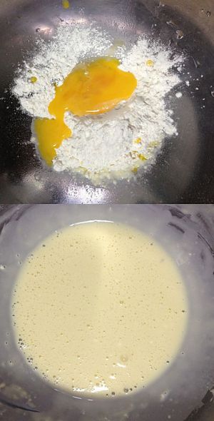 低筋面粉过筛,冷藏过的鸡蛋蛋黄一枚,兑冰水加泡打粉搅匀成面糊。加适量冰块使其保持冰的温度。(注意一定要用冰水和冷藏过的鸡蛋。别问我为什么,我都懒得解释为什么,我会告诉你我也不知道为什么吗?)