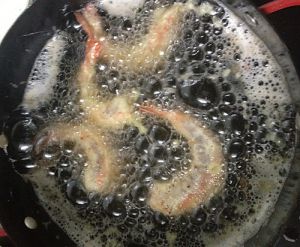 炸好蔬菜类的捞出沥油,大虾锅糊开炸,同样表壳变色即可捞出。