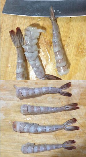 大虾去虾头,剥皮留虾尾。用刀背挤去虾尾水份,把虾尾中间尖尖的部分也剔除。虾背去虾线,腹部切三刀断开虾筋使虾直立。厨房用纸裹住虾身去掉多余水份。盐和胡椒粉少量撒于虾身腌个10来分钟。