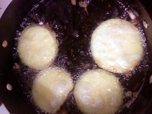 多放点油穷不死,自家用油,二次食用不算地沟油。油温7成(油温不能太低,太低蔬菜吸油太多,出锅不脆)蔬菜挂糊下锅炸,表壳微黄即可捞出。(注意不要挂太多糊,沾一下就行,又不是吃锅包菜,锅包虾)