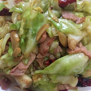 炒到培根看起来颜色不那么淡,就可以放入包菜了(培根很好炒,如果用的是开袋即食的火腿,时间就更短些)。加入适量蒸鱼豉油,和少量盐(蒸鱼豉油里本来就有咸味,所以少加盐)。出锅时倒一点点花椒油。