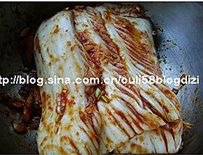 梨子苹果切成丝;葱姜蒜剁末,加入1大勺虾酱、2勺白糖、2勺辣椒粉、2勺辣椒酱和白菜拌匀