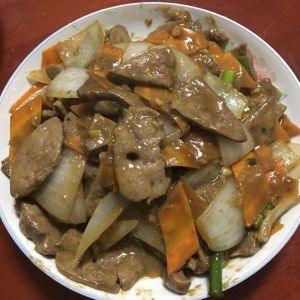菜基本炒熟时,放入肝和另外一半料汁,翻炒至全熟,并加入水淀粉勾芡收汤。