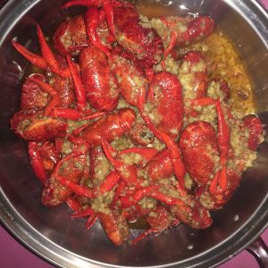 锅下差不多四两的油,放入少量花椒炒香。将虾放入锅中,倒入一勺料酒、三大勺蚝油翻炒