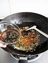 翻炒至香味溢出时,加入调好的调味料,中火煮开烧成调味汁。