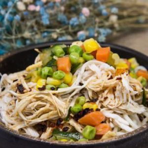 放入鸡丝和丁类混合菜,倒入调料即可。调料要在另外一个碗里先混合调好再淋上去。