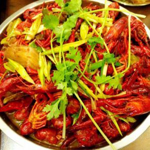 将小龙虾用大盆盛出,留汤汁在锅中,将青椒丝和红椒丝扔进锅中,水开后,连汤汁和辣椒丝倒入虾上面。最后放几条香菜点缀。