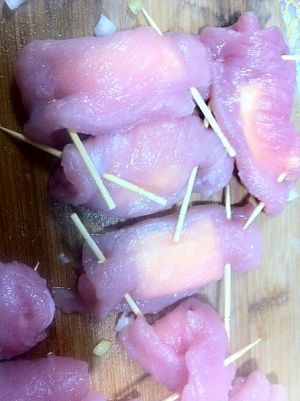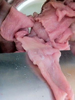 里脊薄切片,并用料酒,盐,葱腌制约30分钟