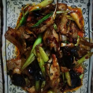 锅内留底油放入葱姜蒜,再放入豆瓣酱炒出红油放入切好的蒜苗、肉片、黑木耳翻炒即可!