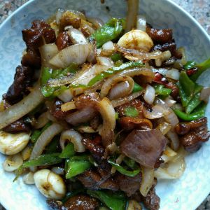 将辣椒,生姜,蒜先下锅煸一会。放入洋葱和青椒