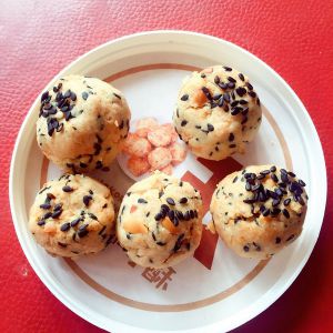 低粉,白砂糖,玉米油,泡打粉,小苏打,黄油,熟花生黑芝麻,混合一起,这种效果,有点干,但是可以捏到一起
