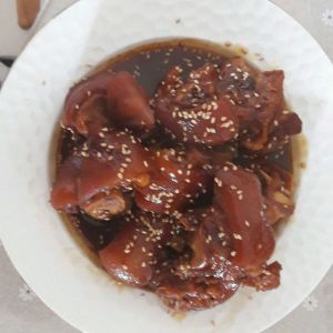 然后加入猪手翻炒,加入料酒,生抽,老抽,耗油,卤水汁,冰糖,再加一大碗水大火烧开,然后小火焖至酥烂。
