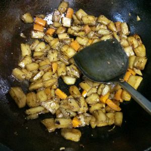 坐锅点火。放油,不要等太热,放入郫县豆瓣酱小火炒几秒,然后加入葱姜末,炒香。加茄子翻炒,倒入调好的汁,快熟时加入胡萝卜(或青椒)翻炒。